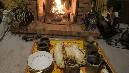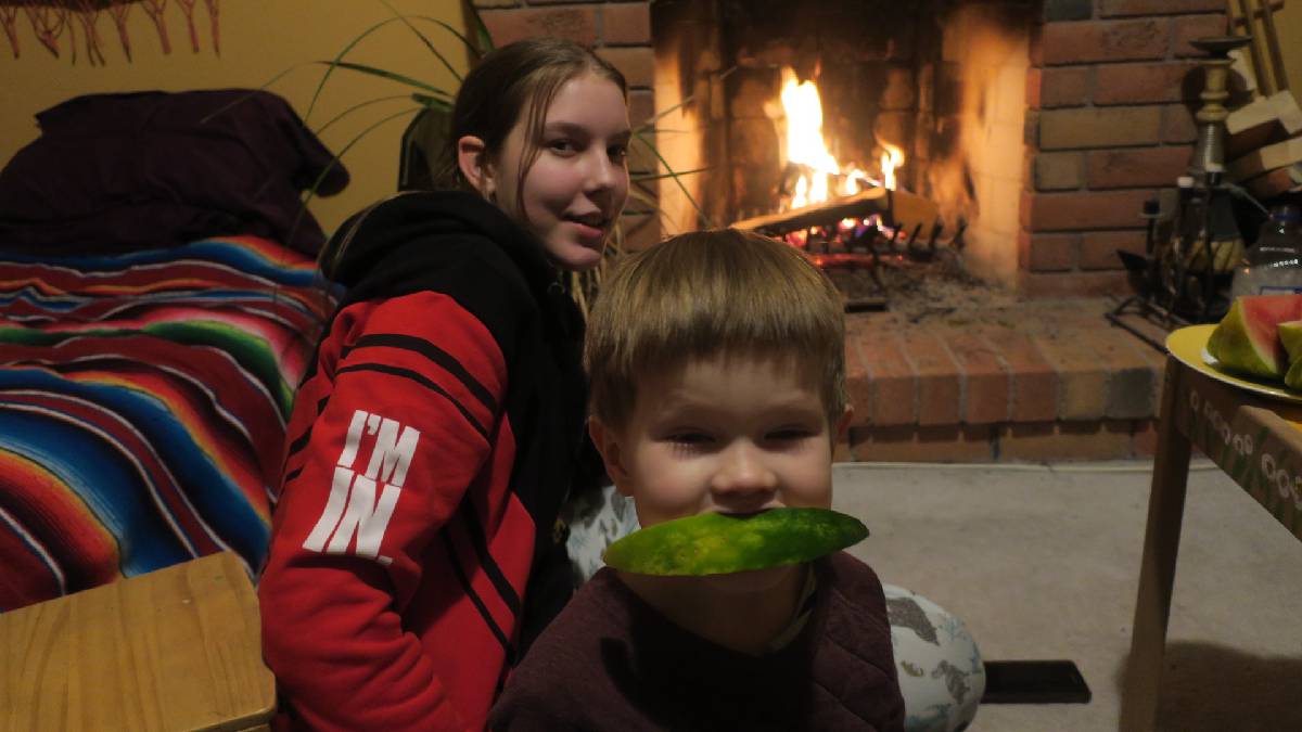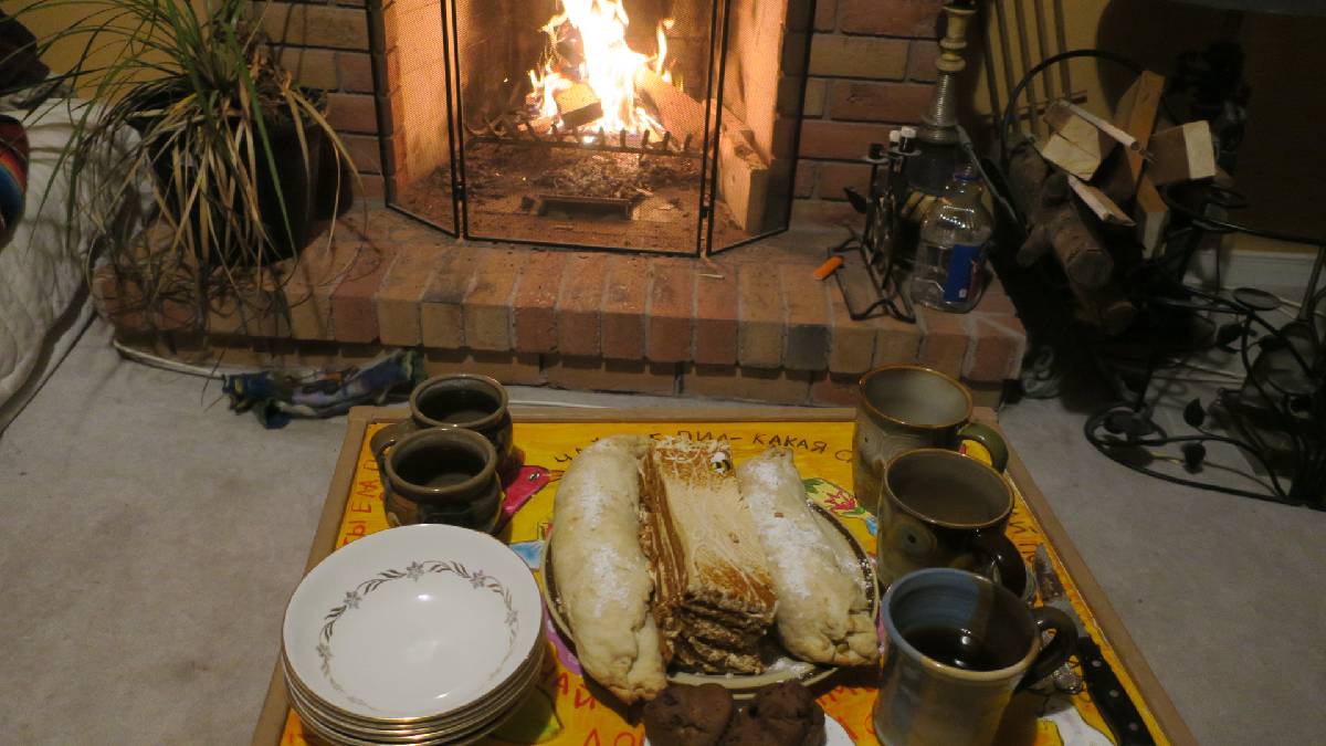 К камину прилагаются всякие "ништяки" в виде арбуза и морса, пирогов, булочек и печенья. Еще у камина можно играть в "слова" смотреть фильмы, да и просто сидеть и смотреть на огонь.