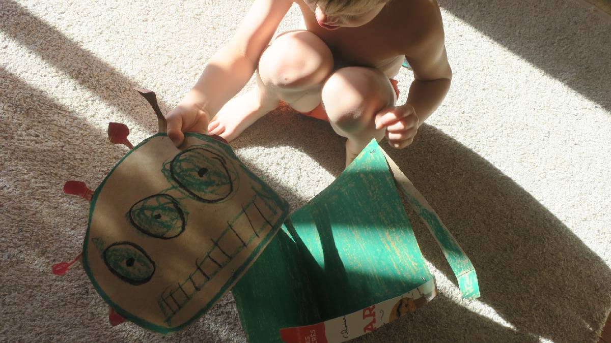 Читали про богатырей и слушали аудиосказки, Тима не сильно проникся, хотя драться он любит. Но вот нарисовали богатыря Огнедышного. Со Славой Тима любит подраться-побороться.